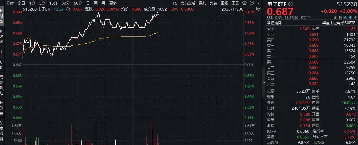 盘面上,11月6日,超142亿主力资金涌入电子板块,板块吸金额高居31个申万一级行业第二位!热门ETF方面,布局电子板块核心资产的电子ETF(515260)场内涨幅一度上探3.15%,现涨3%,盘中收复5日、20日均线。